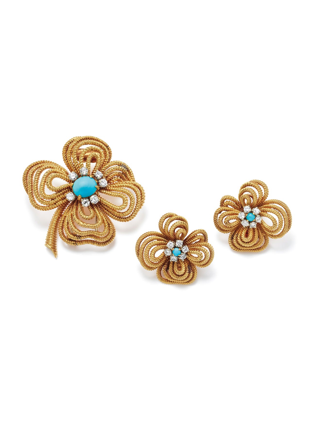 A Turquoise, Diamond and Gold Brooch and Earring Set
