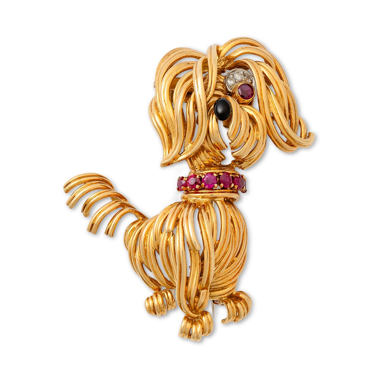 Gold, ruby, onyx and diamond brooch