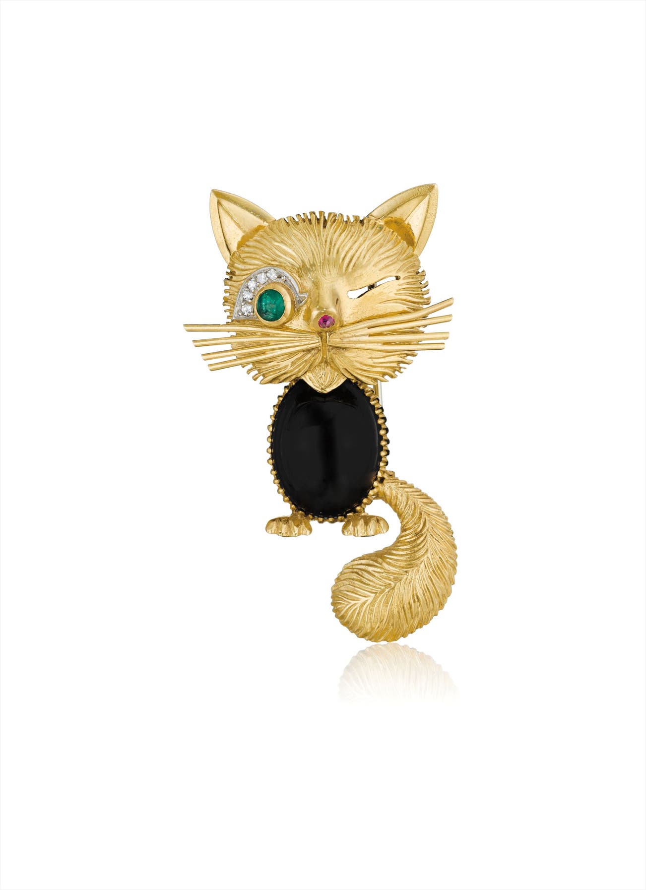 A Gold, Onyx, Emerald, and Diamond 'Winking Cat' Brooch