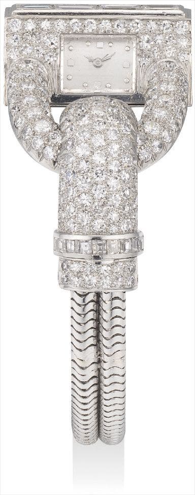 A platinum and diamond-set Cadenas, circa 1936, which is identical to the present lot, fitted with the same dial configuration and numerals, but with a less formal colour, was given as a gift from King Edward VIII to the Duchess of Windsor. The case is inscribed in a facsimile of the King’s handwriting and given to her for their third anniversary. The watch, once owned by the Duchess is now currently in the Van Cleef & Arpels collection. This watch was sold at Sotheby’s in Geneva in 2011 when it was included as property from the Collection of Condesa Vda. de Romanones and Formerly in the Collection of the Duchess of Windsor.