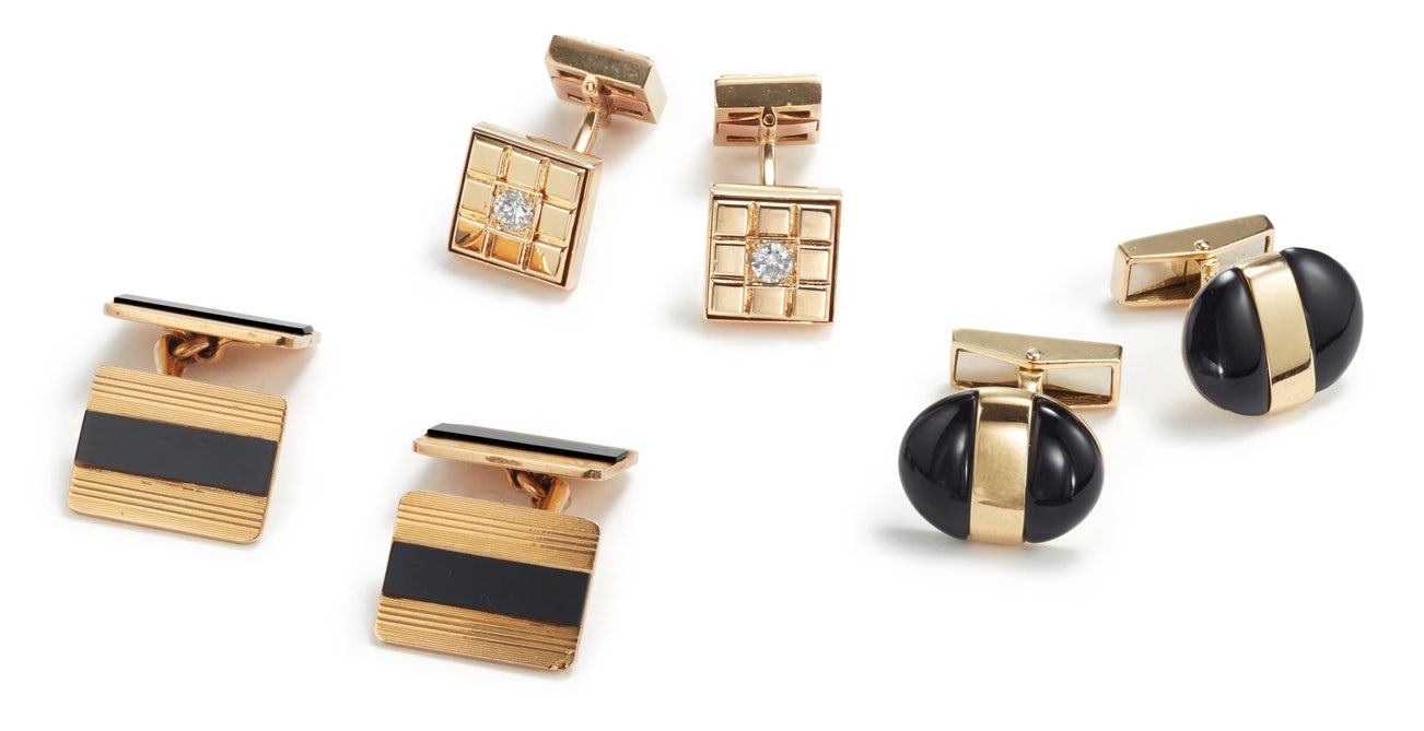 Three Pairs of Gold, Onyx and Diamond Cufflinks