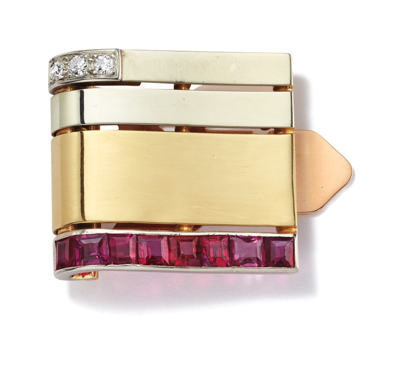 An Art Deco Ruby, Diamond, Platinum and Gold Clip
