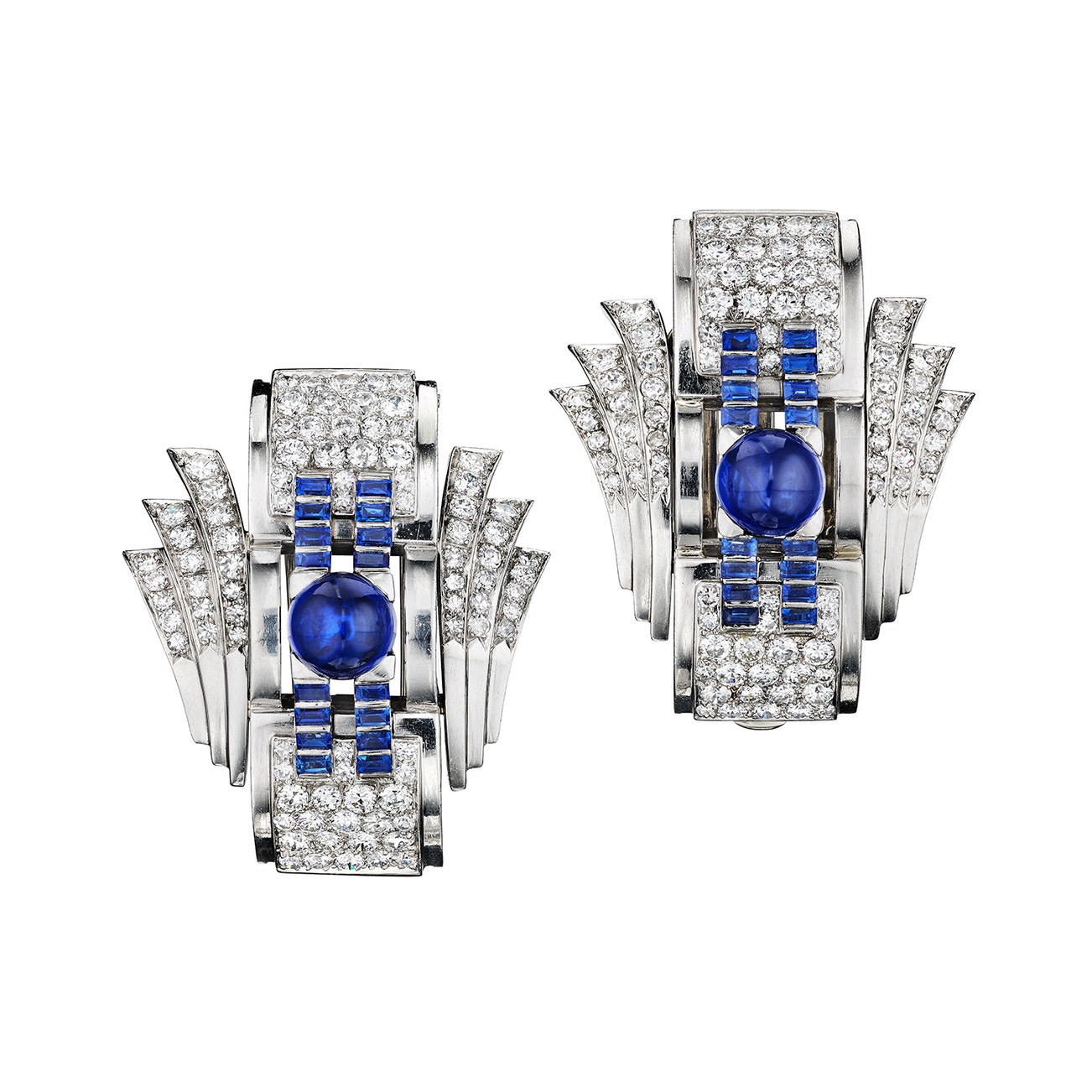 Art Deco Diamond and Sapphire Clip Brooch; Together with a Similar Clip