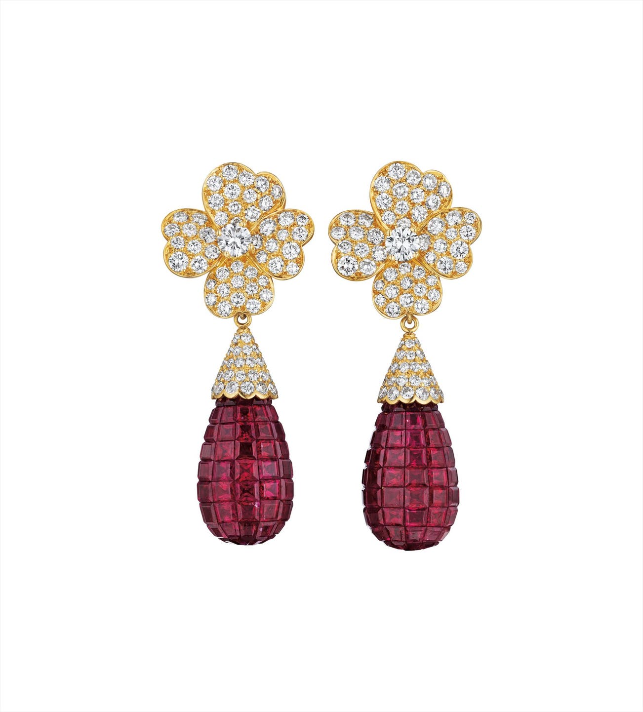 A Pair of Diamond and Ruby Ear Pendants