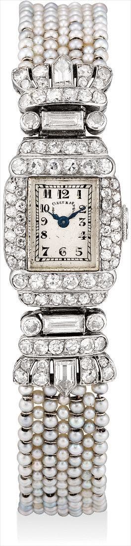 The bracelet is comprised of original seed pearls, which are intact despite the age of the watch. While the case and bracelet was manufactured by Van Cleef & Arpels, the movement was made by Vacheron & Constantin, which is typical of the period. Furthermore, the present is in very appealing and original condition. This setting is complete throughout and the watch has a very art-deco look, which further enhances its rarity.