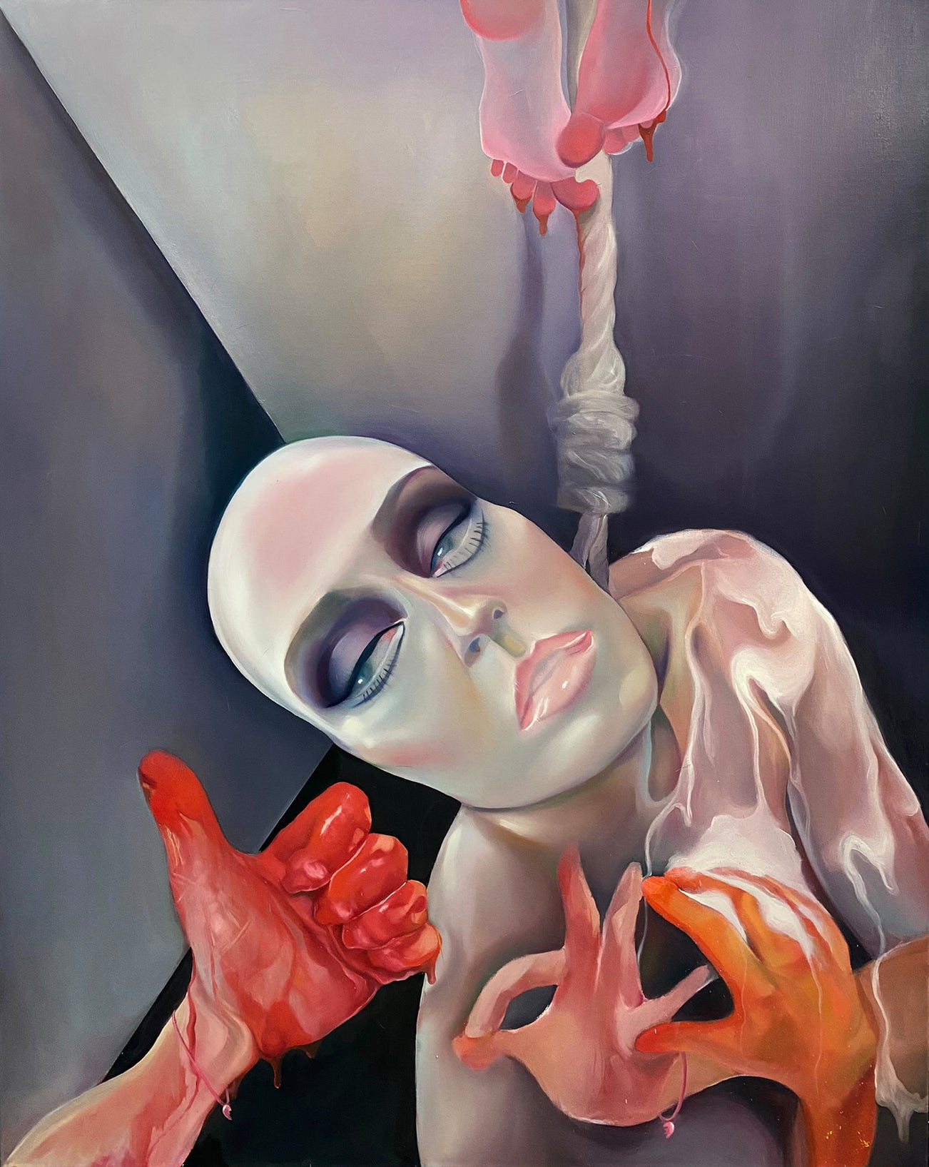 Vanessa Liem’s (b. 2002, Singapore) figurative paintings tackle the human condition by conjuring windows into real yet illusory worlds. In Make Sure to Use Soap, the subject feels emotionally invalidated, leading to pain and suffering articulated through fragmented bodies with disembodied floating limbs. However the sufferer shows a desire to heal by vicariously experiencing the feelings of the outsider while in despair.