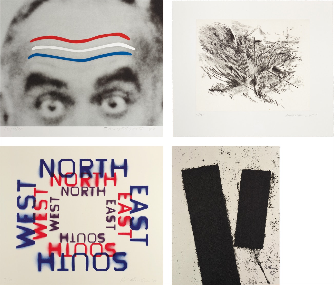 Including: John Baldessari Raised Eyebrows/Furrowed Foreheads (Red, White, and Blue), Julie Mehretu Untitled 1 (amulets), Ed Ruscha All Points, and Richard Serra Prominent Notebook Drawing