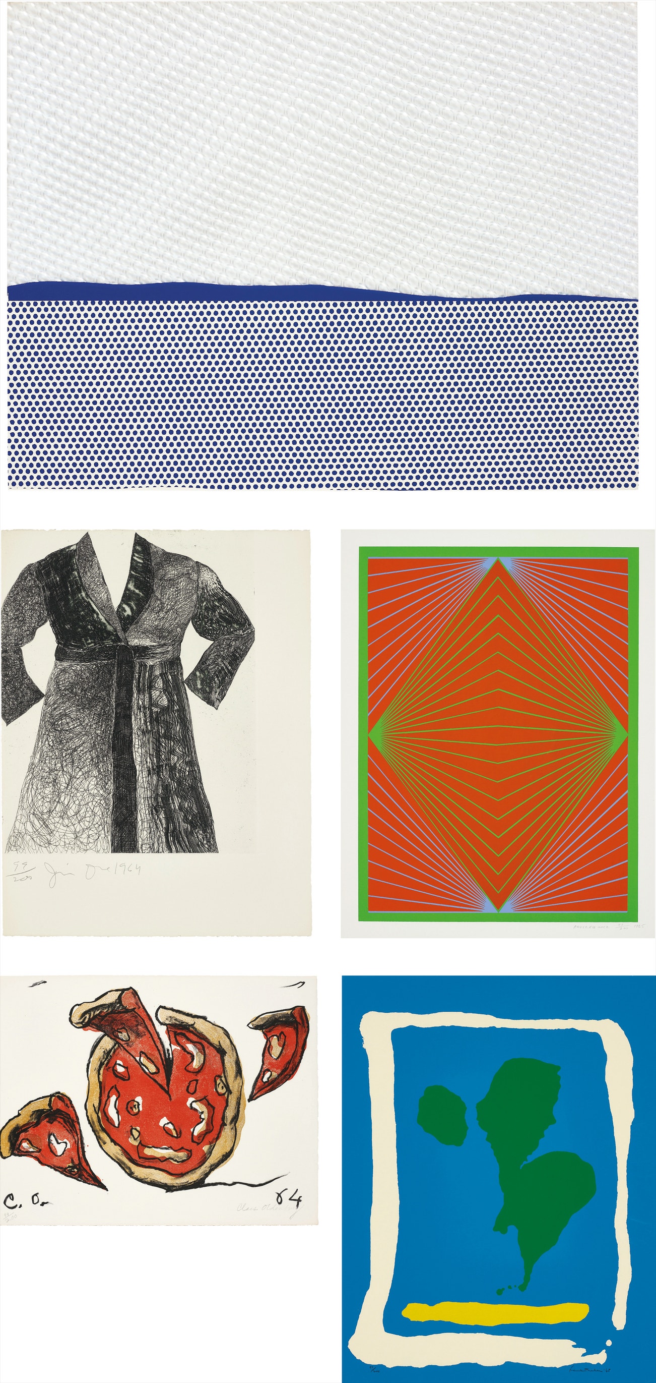 Including Roy Lichtenstein Seascape I, Jim Dine Self Portrait, Richard Anuskiewicz Diamond Chroma, Nicholas Krushenick James Bond Meets Pussy Galore, Helen Frankenthaler Air Frame, George Segal Woman Brushing Her Hair, Tom Wesselmann Still Life, Mon Levinson Untitled #1, Claes Oldenburg Flying Pizza, and Robert Kulicke Dum-Dum Rose,