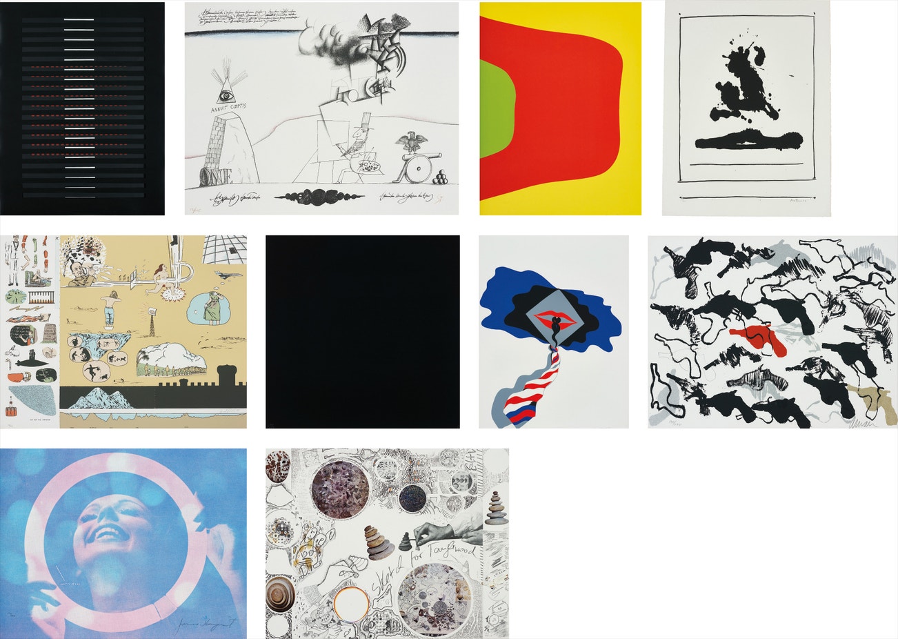 Including: John Goodyear Two-Sided Movement, Saul Steinberg Sam's Art, Charles Hinman Print Collage, Robert Motherwell Untitled, Öyvind Fahlström Eddie (Sylvie's Brother) in the Desert, Ad Reinhardt Abstract Print, Allen Jones Self, Arman Boom-Boom, James Rosenquist Somewhere to Light, and Mary Bauermeister Sketch for Tanglewood Press