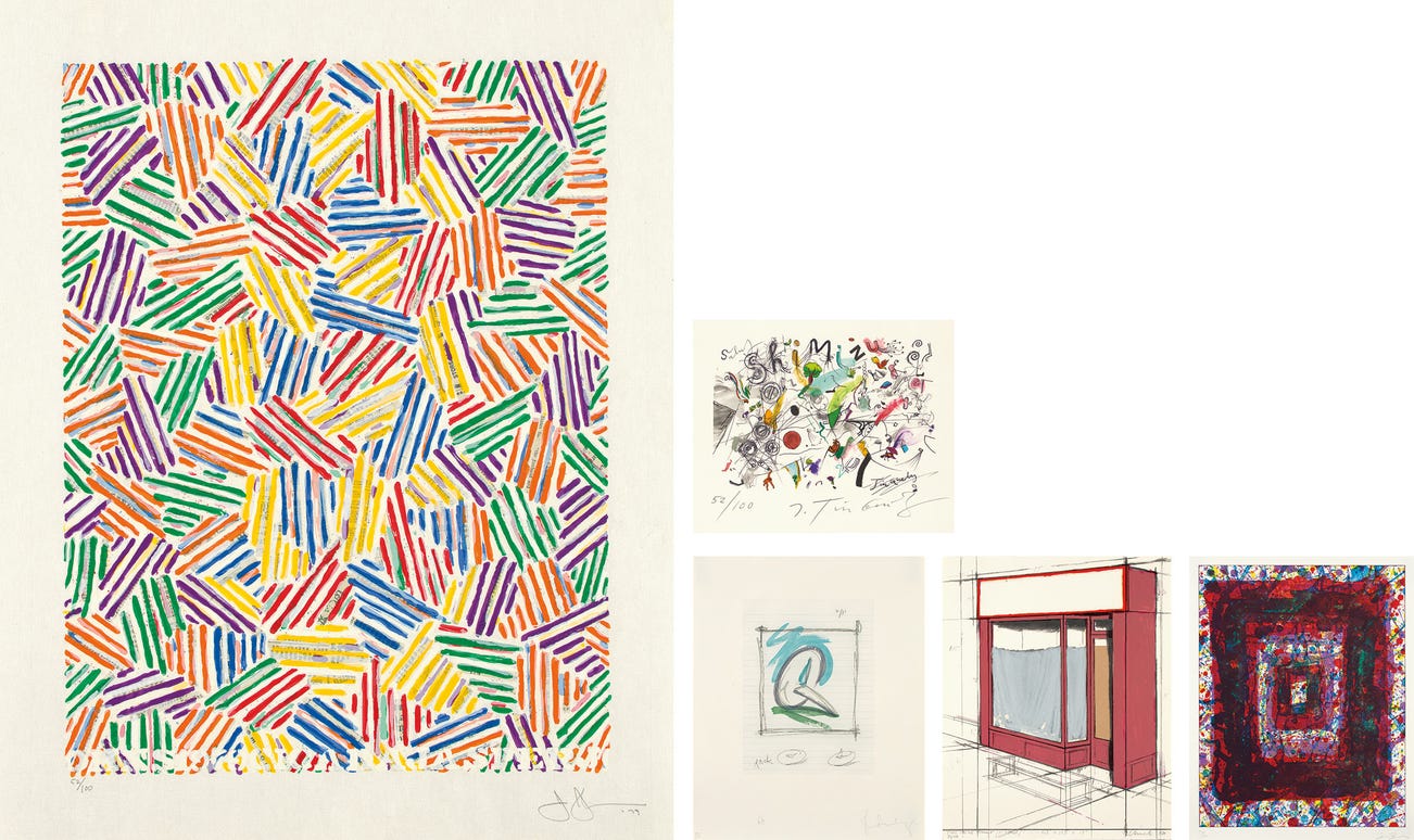Including: Sam Francis, Untitled; Jean Tinguely, Untitled; Claes Oldenburg, Sketch for a Sculpture in the Form of a Steel Tack; Jasper Johns, Cicada; and Christo, Pink Store Front, Project