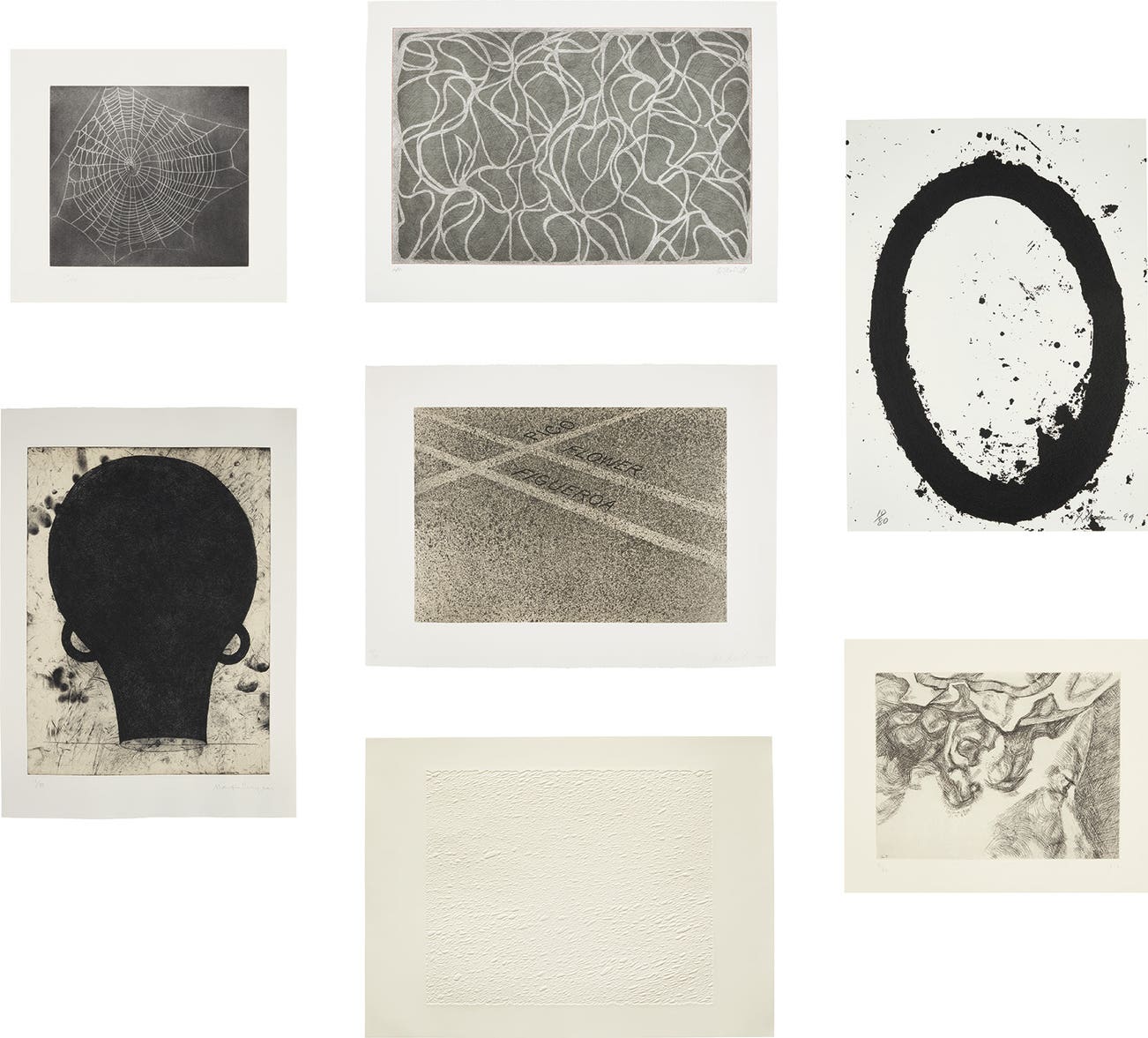 Including: Lucien Freud, After Chardin (Small Plate); Vija Celmins, Untitled (Web 1); Ann Hamilton, Written; Brice Marden, L.A. Muses; Martin Puryear, Untitled; Ed Ruscha, Pico, Flower, Figueroa; and Richard Serra, MOCA print