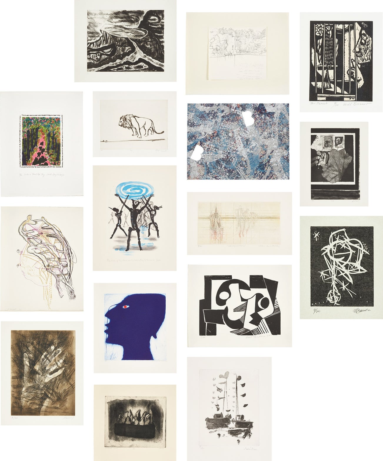 The complete set of 16 prints including eight etchings, three woodcuts, two lithographs, one monotype, one ink drawing tipped onto wove paper, and one drypoint, in black and in colors, on various wove papers, with full margins and the full sheets, with title page, colophon and introduction by Max Roach, all contained in the origial mustard cloth-covered portfolio.
