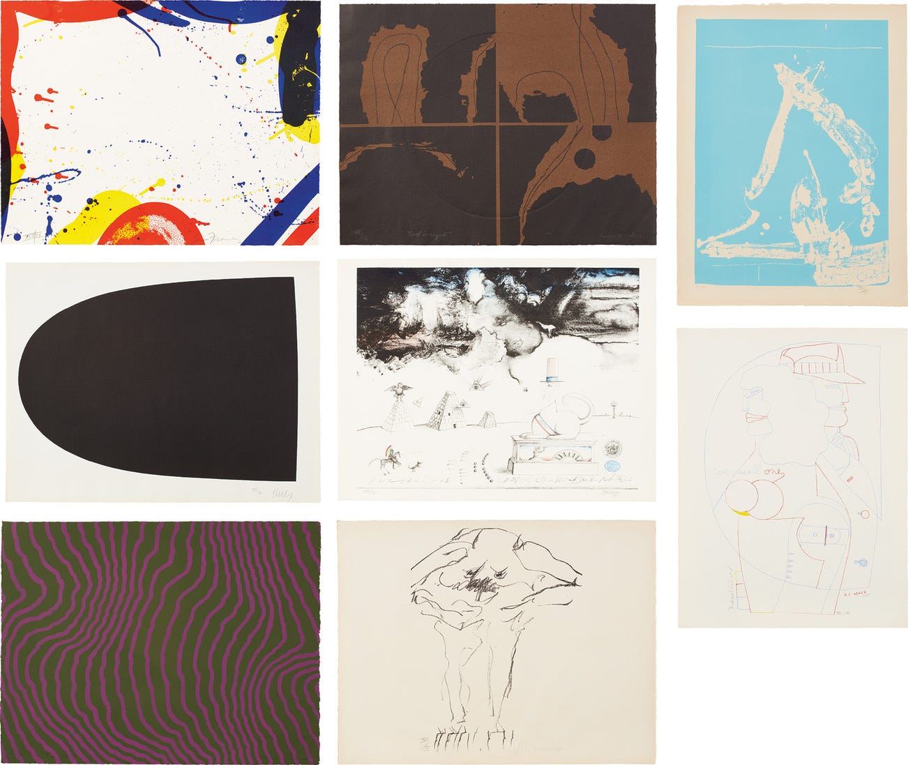 Including: Sam Francis, Untitled; Louise Nevelson, Dusk in August; Richard Lindner, [Untitled]; Saul Steinberg, Thirteen Colonies; Willem de Kooning, Clam Digger (Litho #3); Robert Motherwell, 9: Untitled; Henry Pearson, Face; and Ellsworth Kelly, Black Form