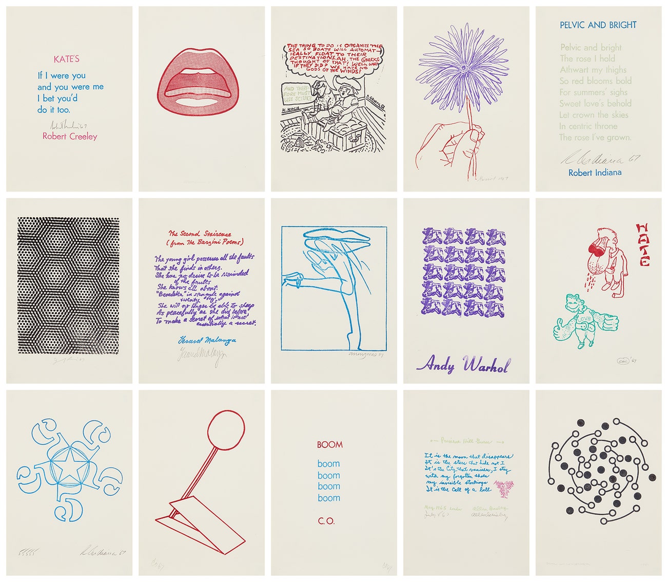 Including: Robert Creeley, Kate's; Peter Saul, Untitled; Robert Indiana, 55555; Claes Oldenburg, Untitled; Claes Oldenburg, Boom; Allen Ginsburg, Primrose Hill Guru; John Willenbecher, Untitled; Tom Wesselmann, Untitled; Kenneth Koch and Red Grooms, Untitled; Marisol, Hand and Flower; Robert Indiana, Pelvic and Bright; Josef Levi, Untitled; Gerard Malanga, The Second Staircase; Allen Jones, Untitled; and Andy Warhol, Purple Cows