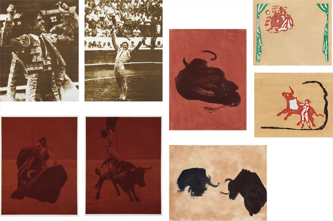 DONALD BAECHLER Corrida de toros I; and Corrida de toros II, coffee stained layout paper with screenprint; PAUL BLANCA Cogida; and Un natural con la izquierda, bull's blood screenprints; LOUIS CLARAMUNT Untitled; andUntitled, clay wash and screenprint; and JIRI GEORG DOKOUPIL Espartaco; and Joselito, bull's shit screenprints.