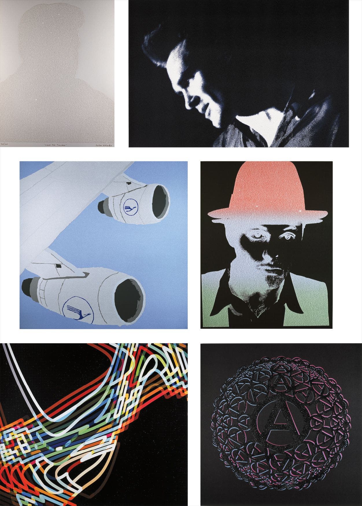The complete portfolio of five screenprints in colours with diamond dust, and one iris print in colours, on either Somerset Satin paper, or bright white Colorplan paper, the full sheets,