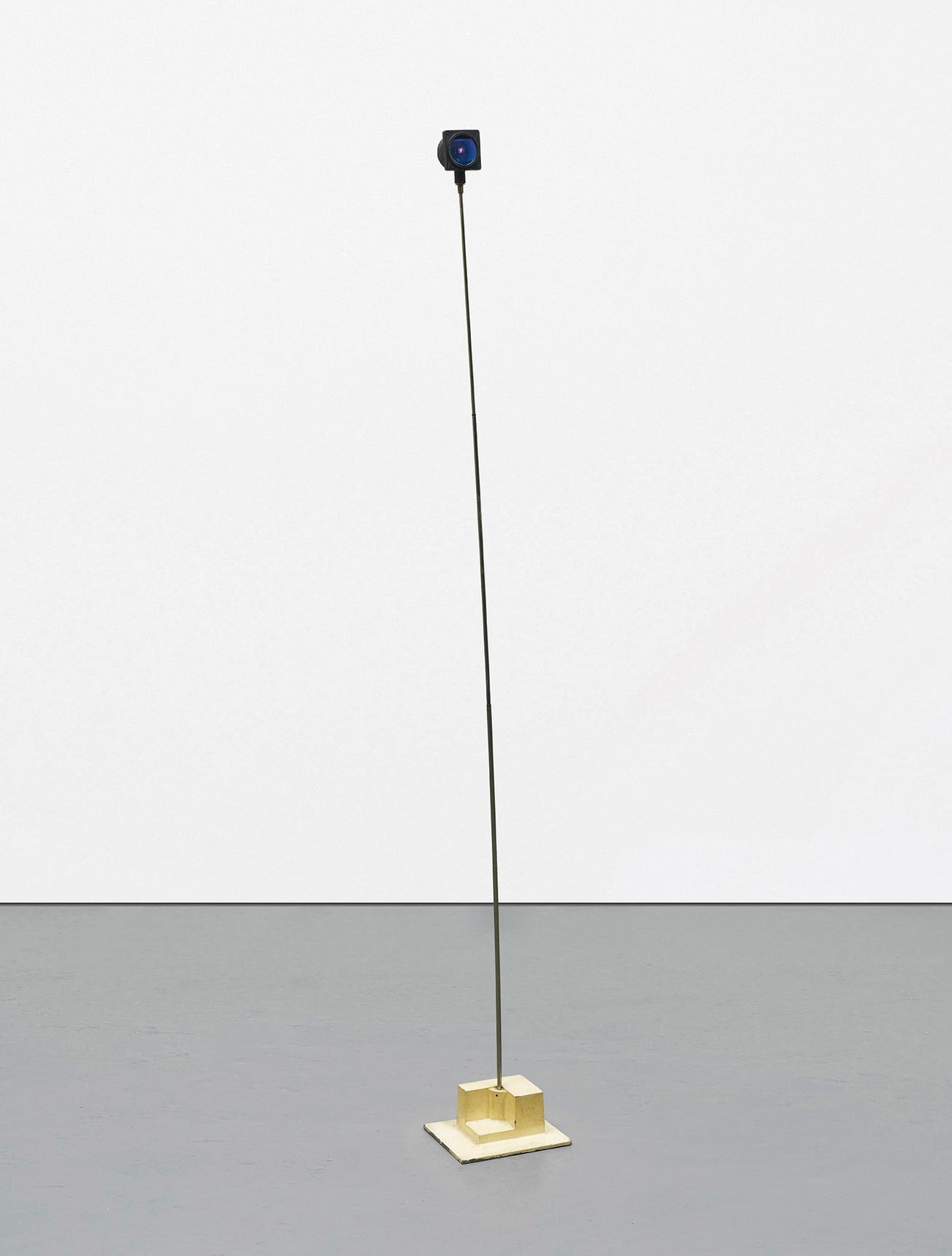 Floor-standing electric multiple comprised of metal casing with textured black finish, blue Plexiglas light filter, metal rod support and beige painted metal base.
