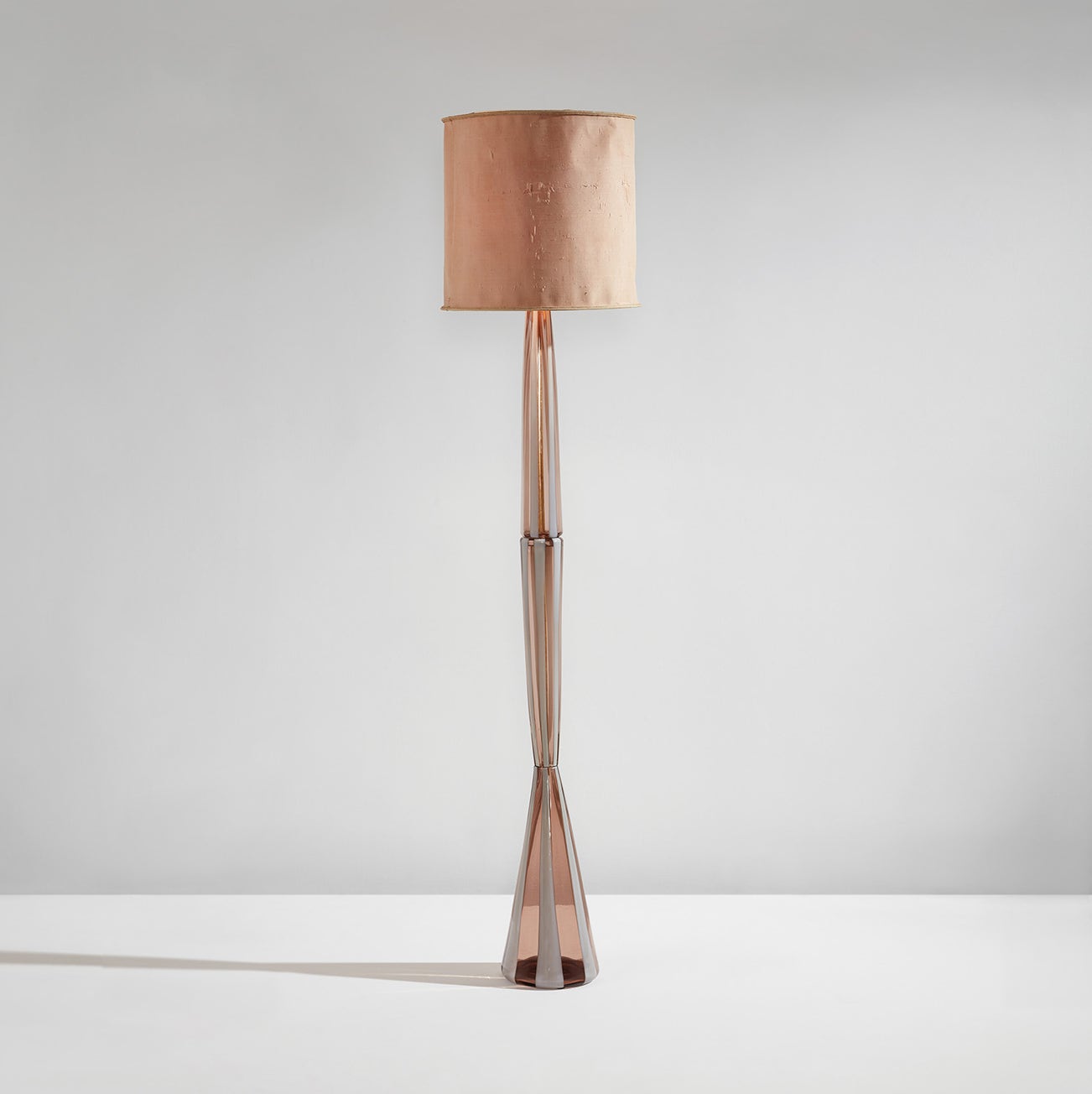 Following Carlo Scarpa’s departure from Venini, the artist Fulvio Bianconi became artistic director. Under Bianconi’s leadership, the company produced some of its most graphic and groundbreaking designs, which are now considered masterpieces of postwar Italian glass design. Though it is not possible to definitively ascribe the present lot’s design to Bianconi, it is assuredly in the style of his work at Venini. In particular, the floor lamp relates to his vase, model no. 4409 from 1951, which also featured glass with vertical polychrome bands.