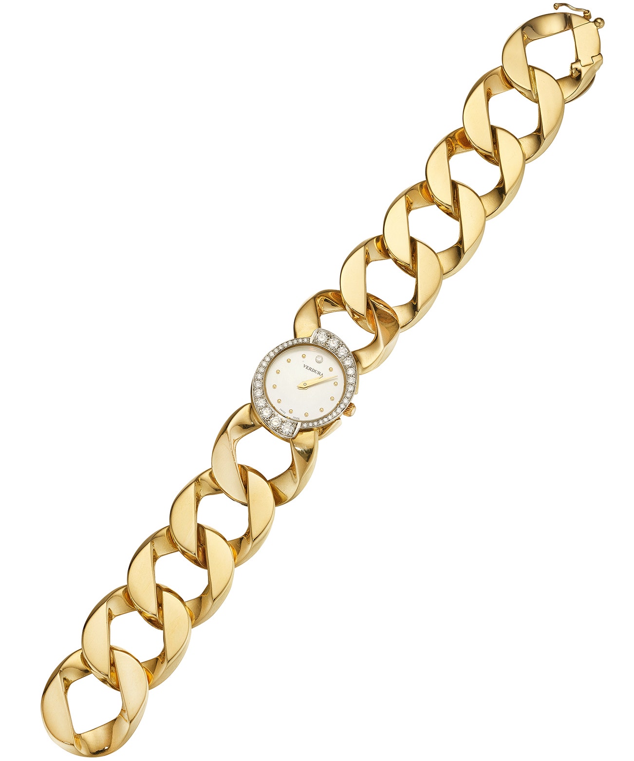 Wristwatch with quartz movement, mother-of-pearl dial, accented by brilliant-cut diamonds, mounted in 18K gold, length measuring approximately 7 1/4 inches, signed Verdura.