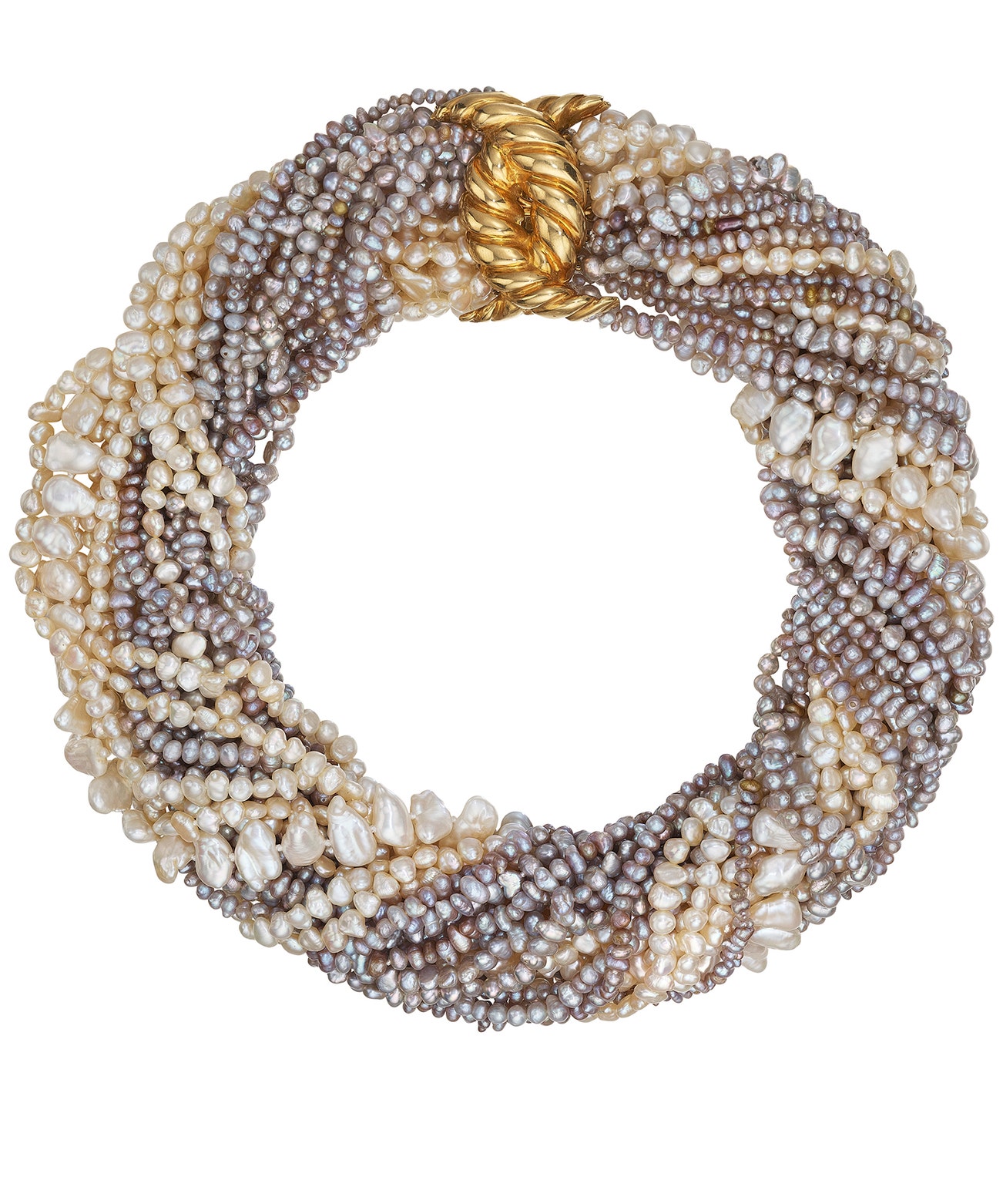 Set with keshi pearl strands, mounted in 18K yellow gold, length measuring approximately 19 inches, signed Verdura with maker's mark.