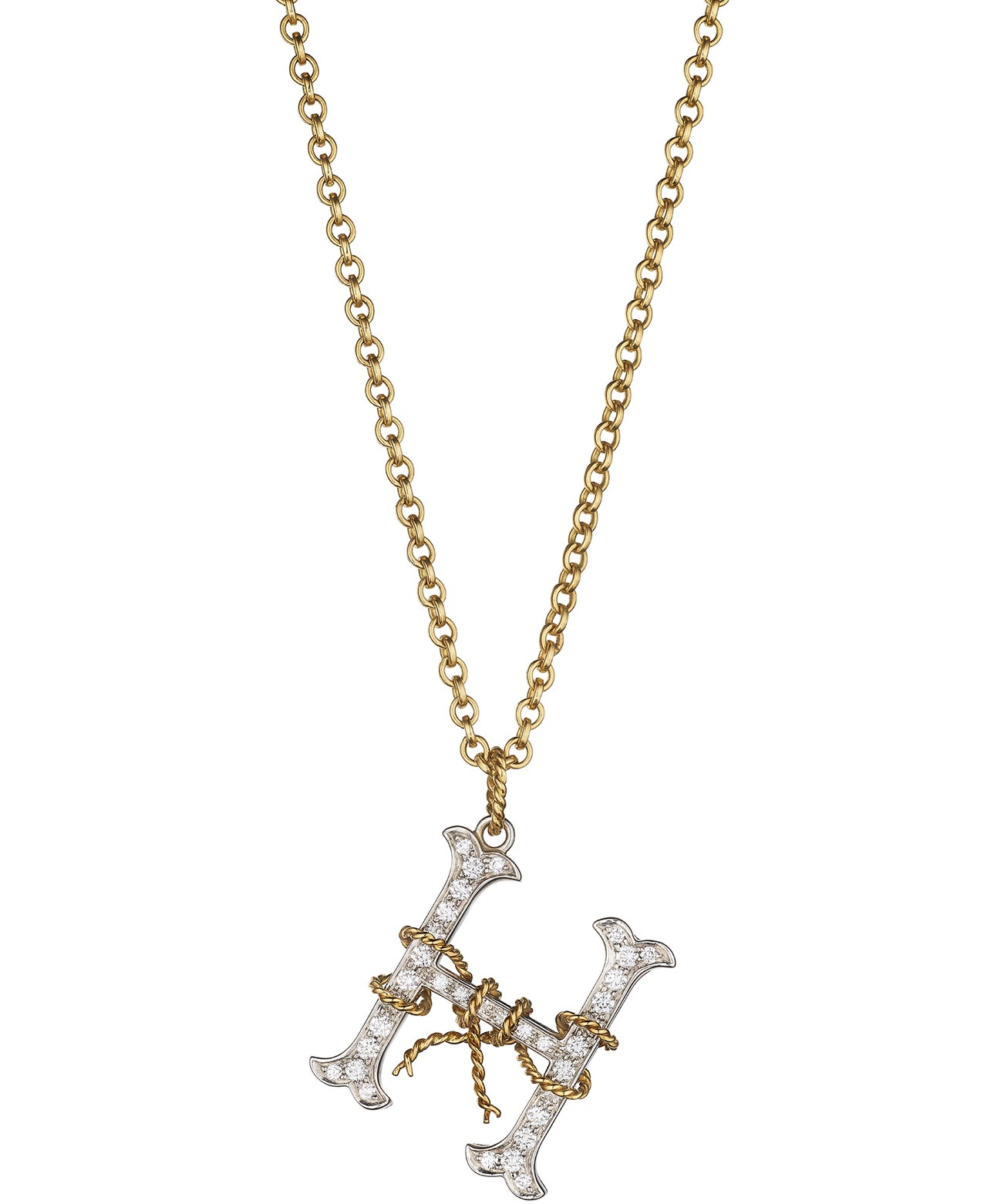 Letter "H", accented with brilliant-cut diamonds, mounted in platinum and 18K yellow gold, pendant length measuring approximately 1 inch, chain length measuring approximately 23 inches, signed Verdura, with maker's mark.
