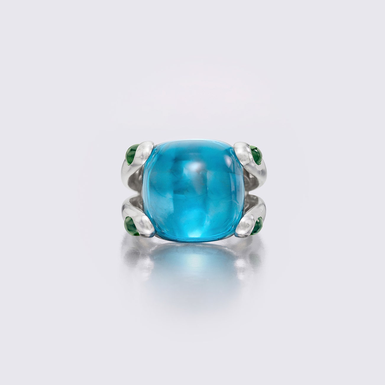 Set with a cushion-shaped blue topaz cabochon, accented by 4 oval-shaped green tourmaline cabochons, mounted in 18K white gold, size 4, signed Verdura, with Italian assay mark.