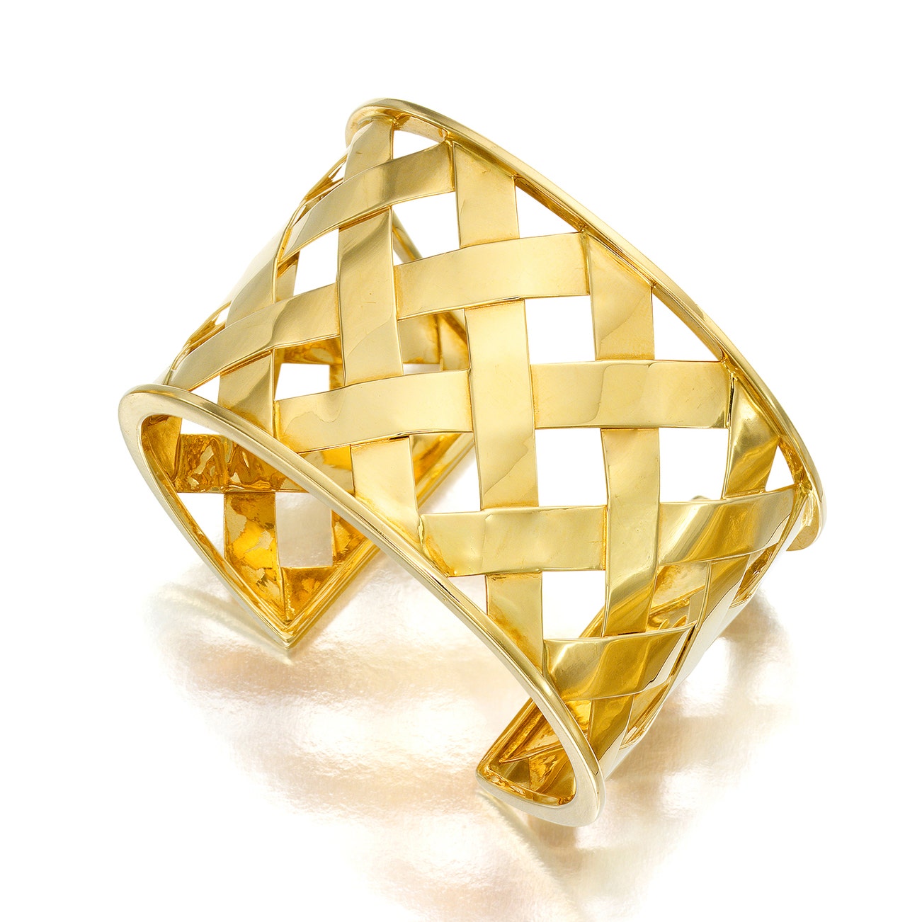 Designed as a woven cuff, mounted in 18K yellow gold, inner circumference approximately 5 3/4 inches, width approximately 1 3/8 inches, signed Verdura.