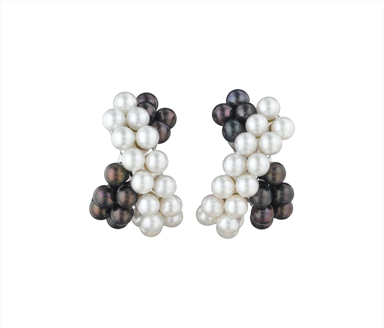 Each of cross-over design, the front set with two rows each of white and black cultured pearls, mounted in 18K white gold, length 1 1/4 inches.