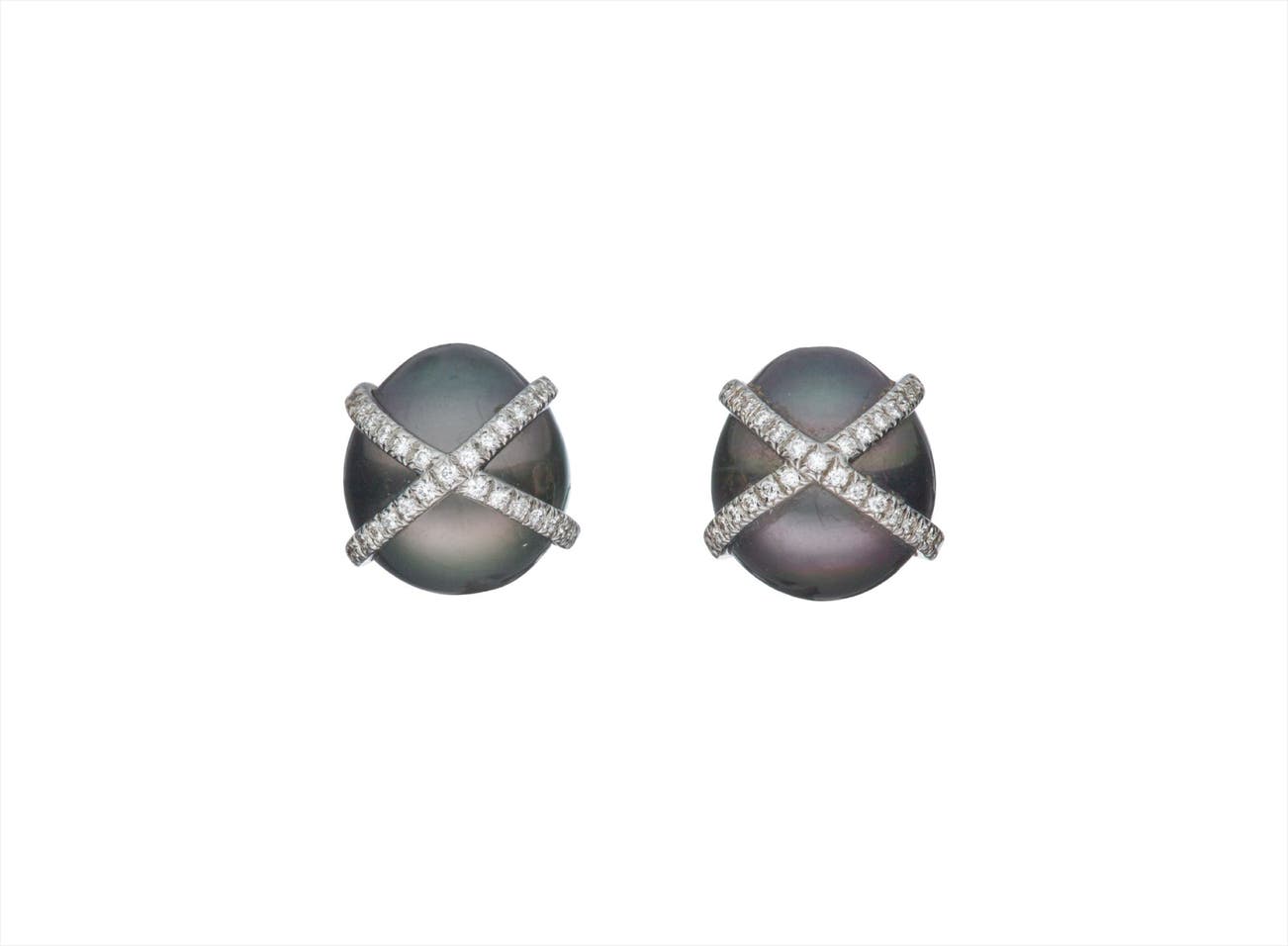 Each set with a Tahitian cultured pearl measuring approximately 14.85 mm, enhanced by two intersecting lines of pavé-set diamonds, mounted in platinum and 18K white gold, length 1/2 inch.