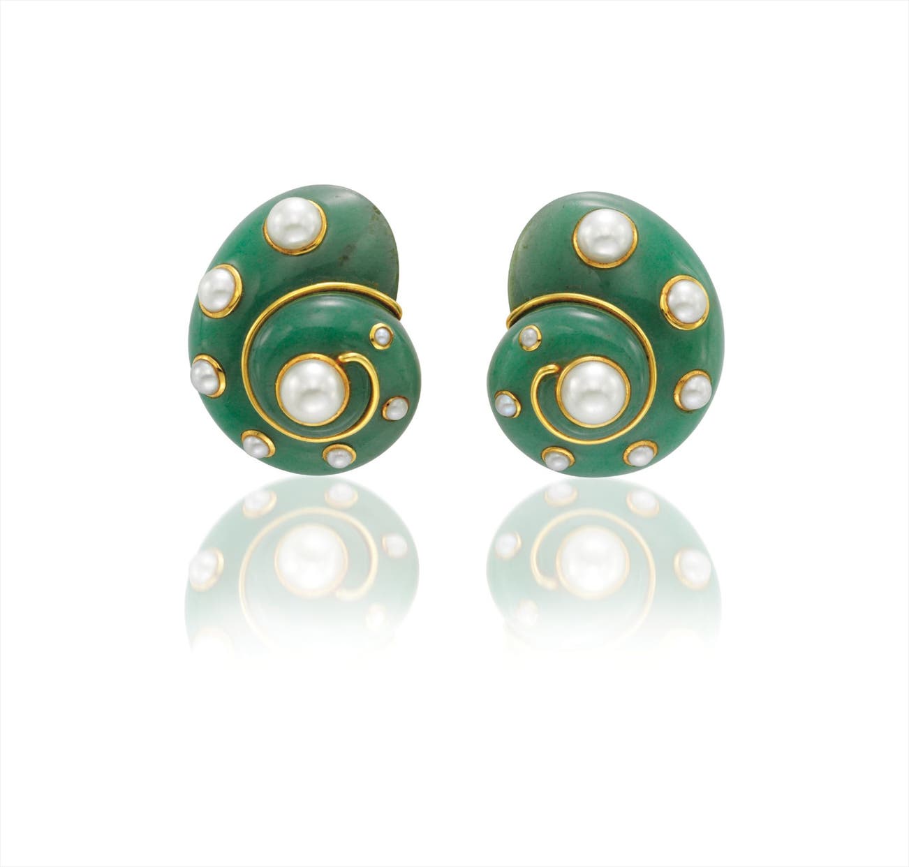 Each designed as a carved aventurine shell, enhanced by cultured pearls and polished gold accents, mounted in 18K yellow gold, length 1 1/4 inches.