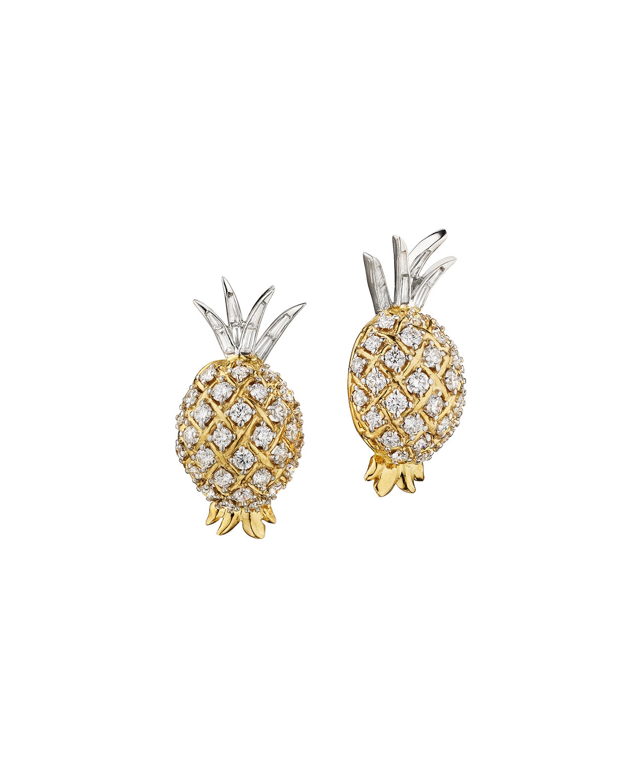 Set with brilliant-cut and baguette diamonds in a pineapple design, mounted in platinum and 18K yellow gold, length measuring approximately 1 inch, signed Verdura, with maker's mark.