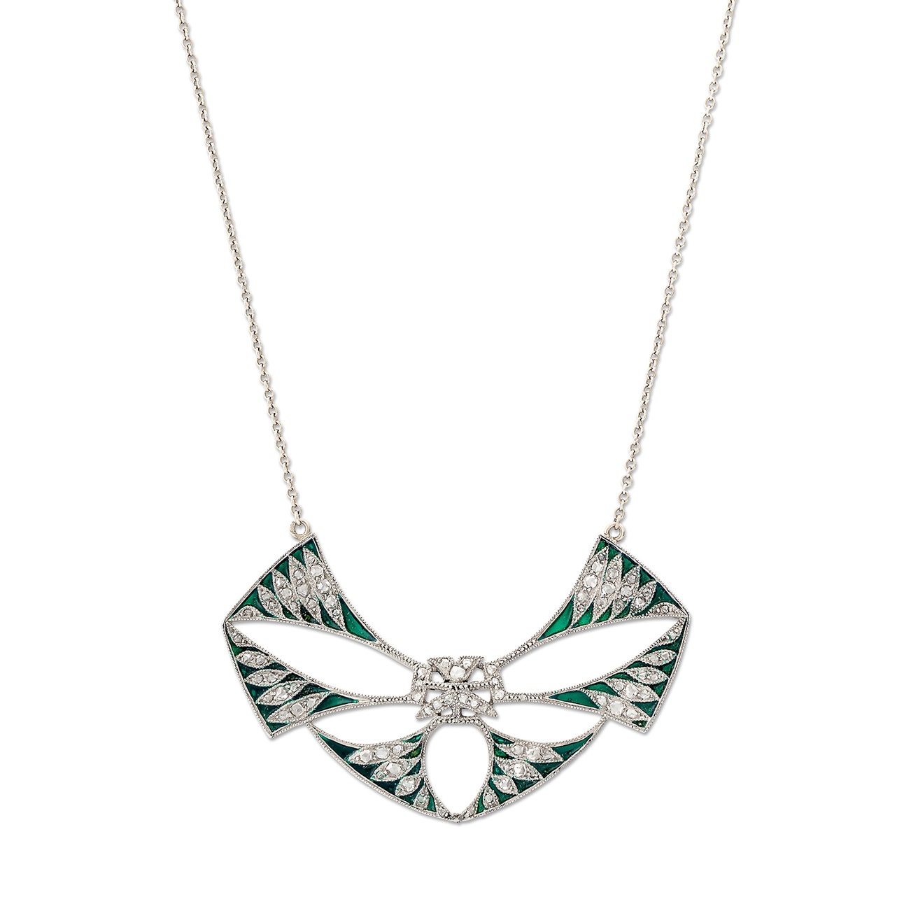 Of openwork geometric design, applied with green enamel, embellished with rose-cut diamonds, measuring approximately 30 x 52mm, suspended from a chain, length approximately 513mm, signed Vever, French assay marks for gold.