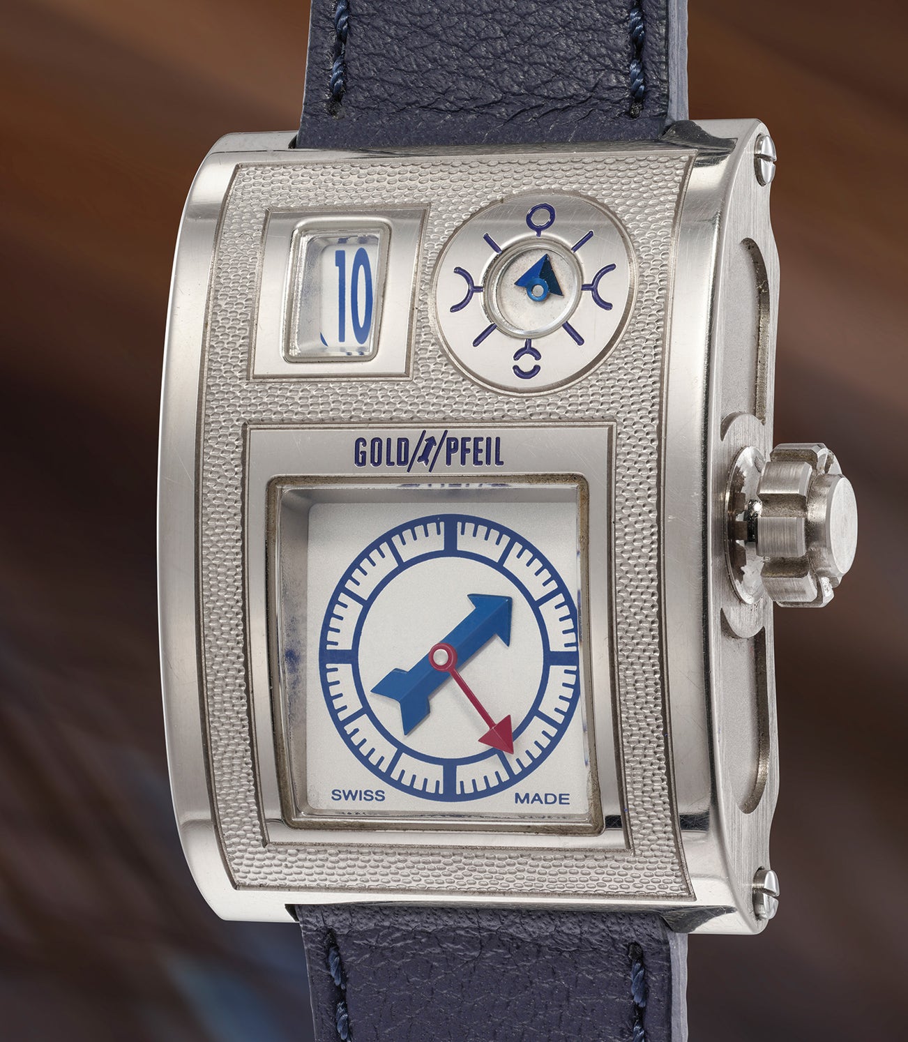 The present Goldpfeil GPVH is the result of an ambitious project executed by the German luxury house that called upon seven members of the Académie Horlogère des Créateurs Indépendants (AHCI) to each produce a limited series of wristwatches that would make a statement in the world of horology in celebration of the new millennium. Among these seven masters (Sven Andersen, Martin Frei with Thomas and Felix Baumgarter, Vincent Calabrese, Vianney Halter, Frank Jutzi, Bernhard Lederer and Antoine Preziuso), the watchmaker who realised the present timepiece is none other than Vianney Halter, best known for his work behind the Antiqua and with Harry Winston for the Opus 3.