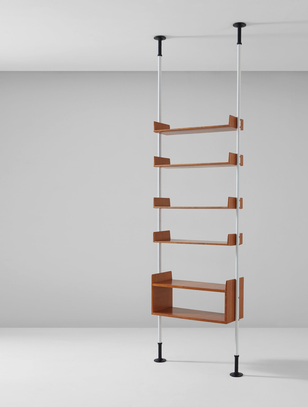 Painted steel, oak-veneered wood, painted metal, brass.