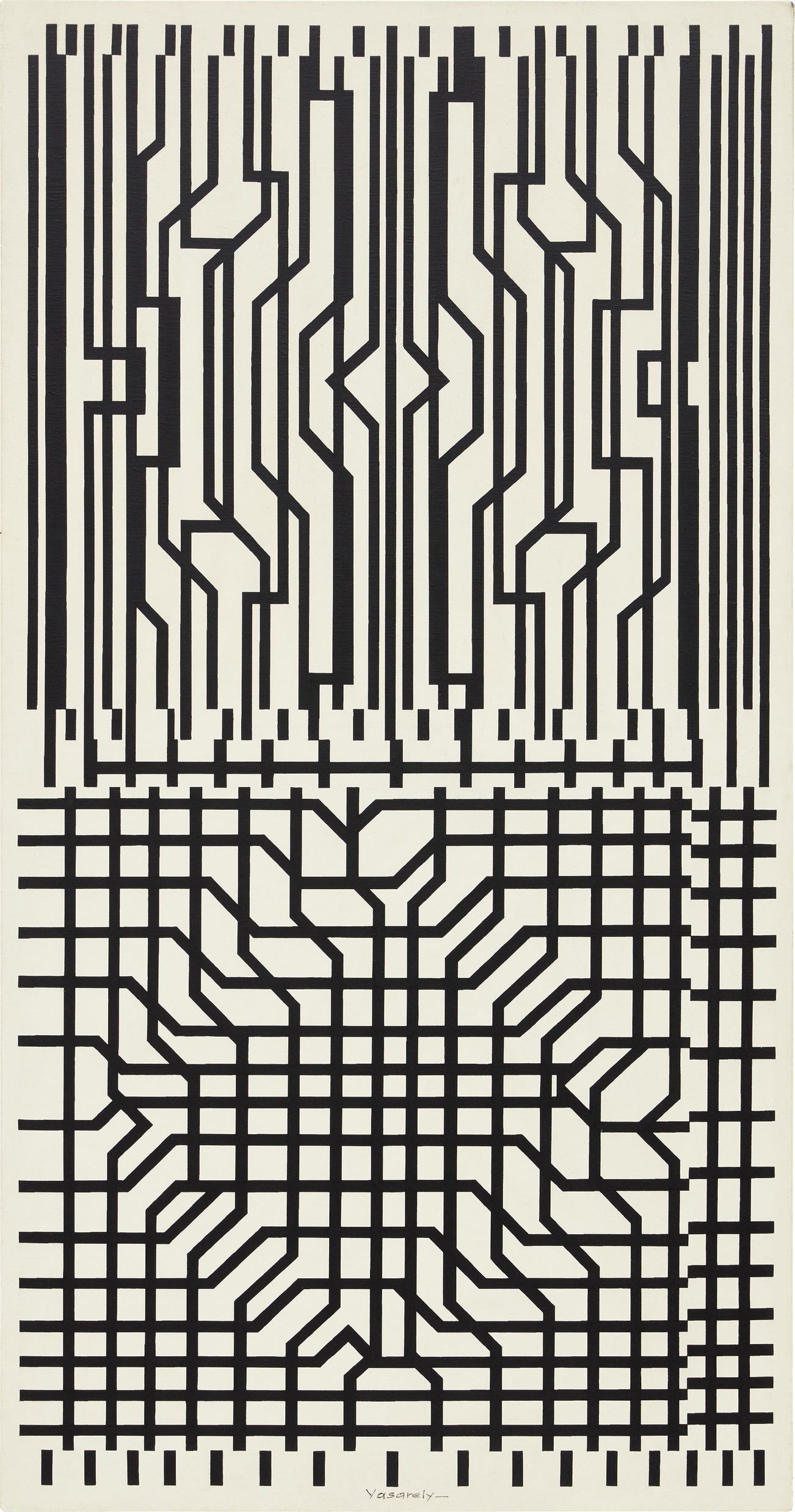 signed "Vasarely–" lower center; signed, titled, inscribed and dated "VASARELY 941 "GRILLES 2" 1952–1960 Vasarely–" on the reverse