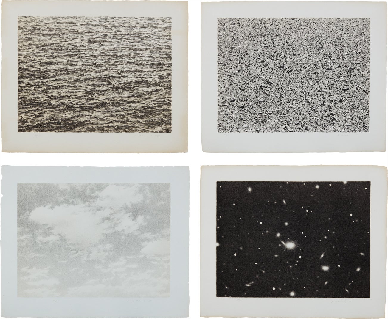 The ocean, the desert, and the stars are sources of endless fascination for artist Vija Celmins, who has meticulously rendered and reinterpreted these vast expanses of the environment across different disciplines since the 1960s. She first became fixated on the serene ocean near her Los Angeles home in the late 1960s, a subject which she began photographing, and in doing so, capturing the frozen states of rippling waves over and over again. These source photographs are the first building block of the artist’s practice, which she carefully reinterprets in drawing, painting and printmaking with precise strength and endurance, depicting an impossible image. Such impossibility lies in the nature of the her oceanscapes, deserts and galaxies which she explains are “nonspecific, too big, spaces unbound”, and endless with their impermanence and resilience. (Vija Celmins in conversation with Jeanne Silverthorne, Parkett 44, 1995) From graphite and painting, Celmin’s draftsmen dexterity and interest in the processes of mark making lead her to the art historical technique of printmaking which she describes as one that is “much more physical [than painting and drawing], with scratching and scraping and constantly having to imagine everything backwards.” (Vija Celmins interviewed by Samatha Rippner, A Delicate Balance, The Prints of Vija Celmins, 2002)