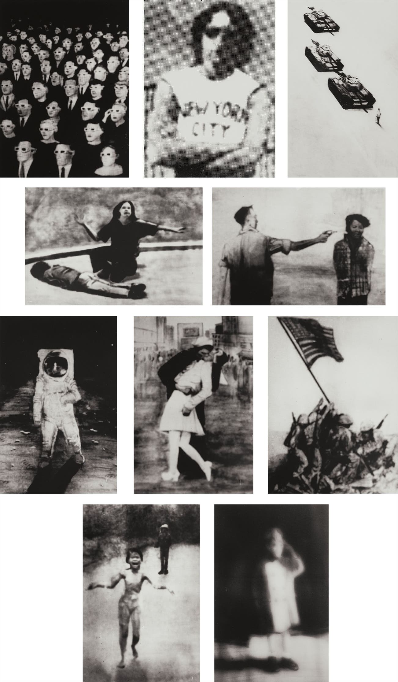 Titles include: Memory Rendering of 3-D Screening, 1989; Memory Rendering of John Lennon in Manhattan, 1989; Memory Rendering of Kiss at Times Square, 1989; Memory Rendering of John John, 1989; Memory Rendering of Tranbang Child, 1989; Memory Rendering of Flag Raising at Mount Subayachi, Iwo Jima, 1989; Memory Rendering of Saigon Execution of a Viet Cong Suspect, 1989; Memory Rendering of Kent State Shooting, 1989; Memory Rendering Of Man On The Moon, 1989; Memory Rendering Of Man Stopping Tank In Beijing, 1989