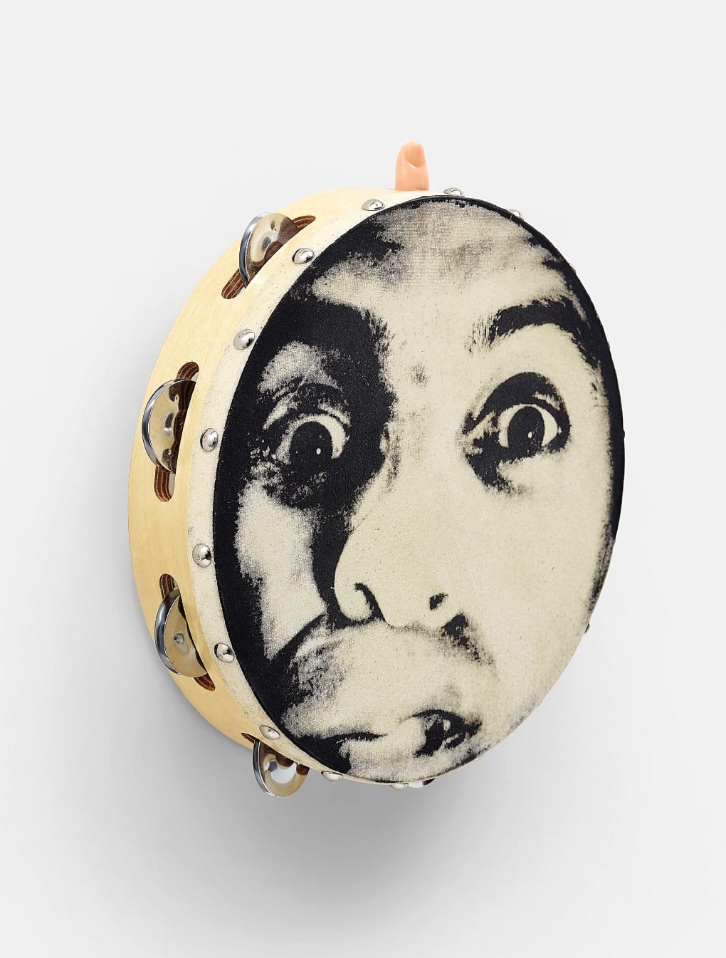 Screenprint on tambourine with moulded plastic finger-hook, with colophon, contained in the original yellow fabric-covered portfolio with printed lid.