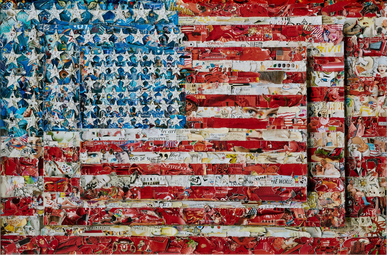 In Three Flags, after Jasper Johns from Pictures of Magazines 2, Muniz reimagines Jasper Johns’ signature work – a trio of American Flags, stacked atop one another, each diminishing in scale. Like Johns, Muniz is interested in recontextualizing the emblematic nature of the original subject matter. While Johns divested the symbolic nature of the American Flag, Muniz takes this a step further, forcing viewers to question both the aesthetics of the American Flag and the originality of his own creation.