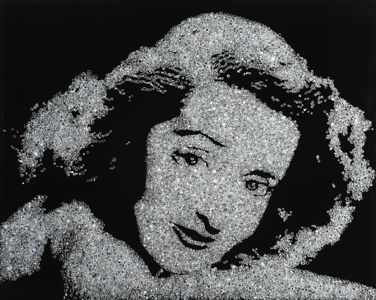 is befitting, therefore, that for his famed series of silver screen sirens, Muniz chose a material that was likewise precious, resplendent and desirable, diamonds. As one of the most celebrated actresses of her time, Bette Davis was among the first leading ladies in Hollywood to define the role of a movie star. Throughout a spectacular career, Davis was the first actress to receive ten Academy Award nominations (of which she won two), was the first woman to receive a Lifetime Achievement Award from the American Film Institute, and she became the first female president of the Academy of Motion Picture Arts and Science. Famous for her roles as much as her strength, Davis was further canonized in American Pop Culture in Kim Carnes’s Number One hit song “Bette Davis Eyes”, in which the beloved star’s sultry gaze is sung in praise and awe. Similarly, in Muniz’s photograph Davis’s seductive expression as rendered in diamonds, mesmerizes the viewers with her beauty as much as with the thousands of jewels of which she is comprised. The dual awareness of subject and material is particularly suitable for the series. “In theater,” Muniz explained, “you have the character and the actor in the same place trying to negotiate each other in front of an audience.” In the current lot, the audience is delighted to have a full awareness of both.