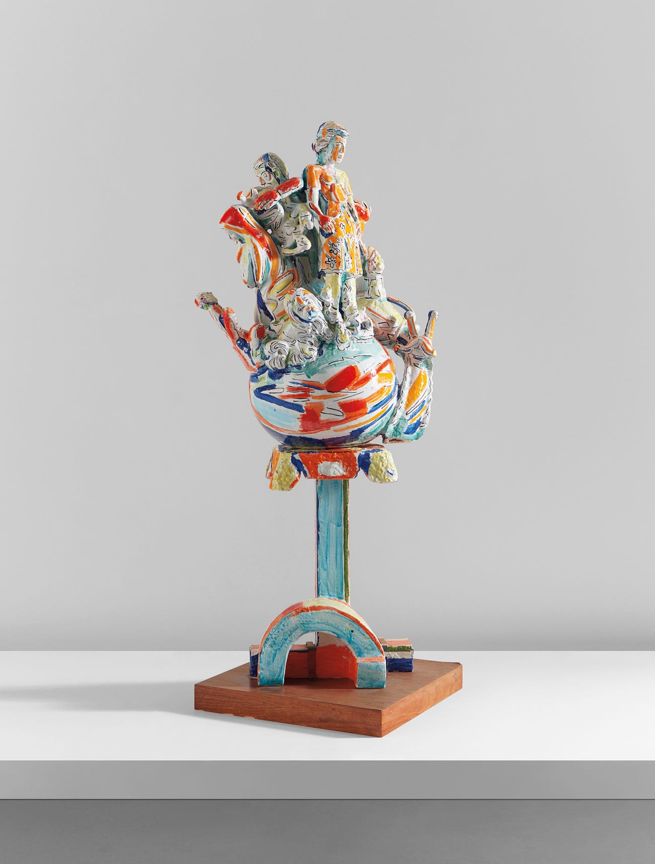 In the 1970s, several exhibitions across the United States shifted the spotlight to the work of female studio ceramists, among them Viola Frey. Frey trained as a painter under Richard Diebenkorn and Mark Rothko while simultaneously studying ceramics, and settled on clay as her primary medium by the 1970s. She had amassed a collection of flea market ceramic figurines and her study of them led to a body of work focused on large-scale figural representations of working class people, a nod to her upbringing on a California farm during the second World War. The present lot is among several works Frey titled “World Civilization.” The figures within these varying sculptures are painted with bold colorful brushstrokes on textured clay surfaces with frequently disproportionate features and often portraying grandmother-like women “holding the world” dressed in old-fashioned clothing, presenting a strong matriarchal image.