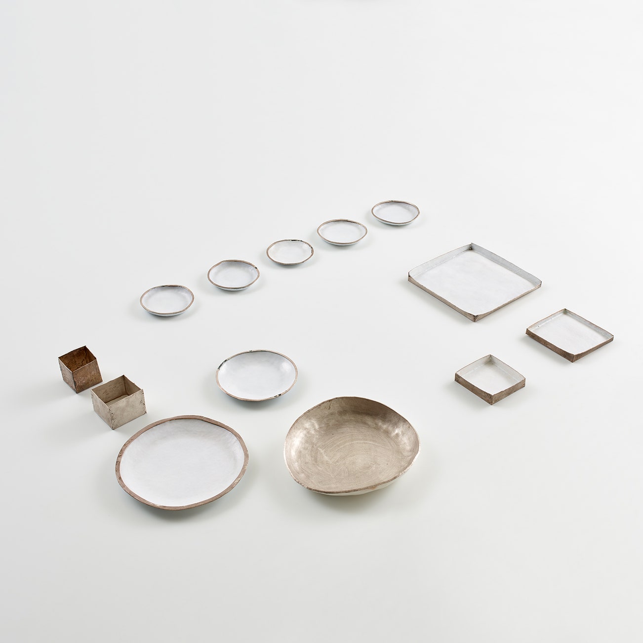 Square vessels and trays: Fine silver, vitreous enamel.