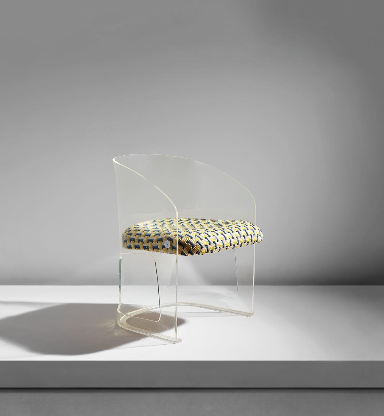 Acrylic, chromium-plated steel, embroidered upholstery.