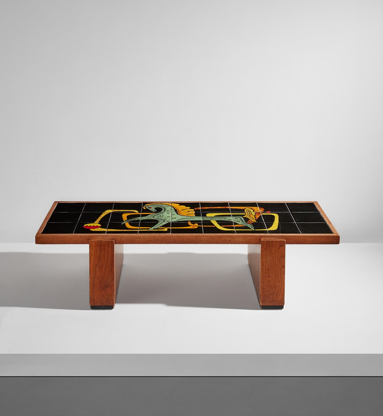 Glazed ceramic, oak, walnut-veneered wood, painted wood.