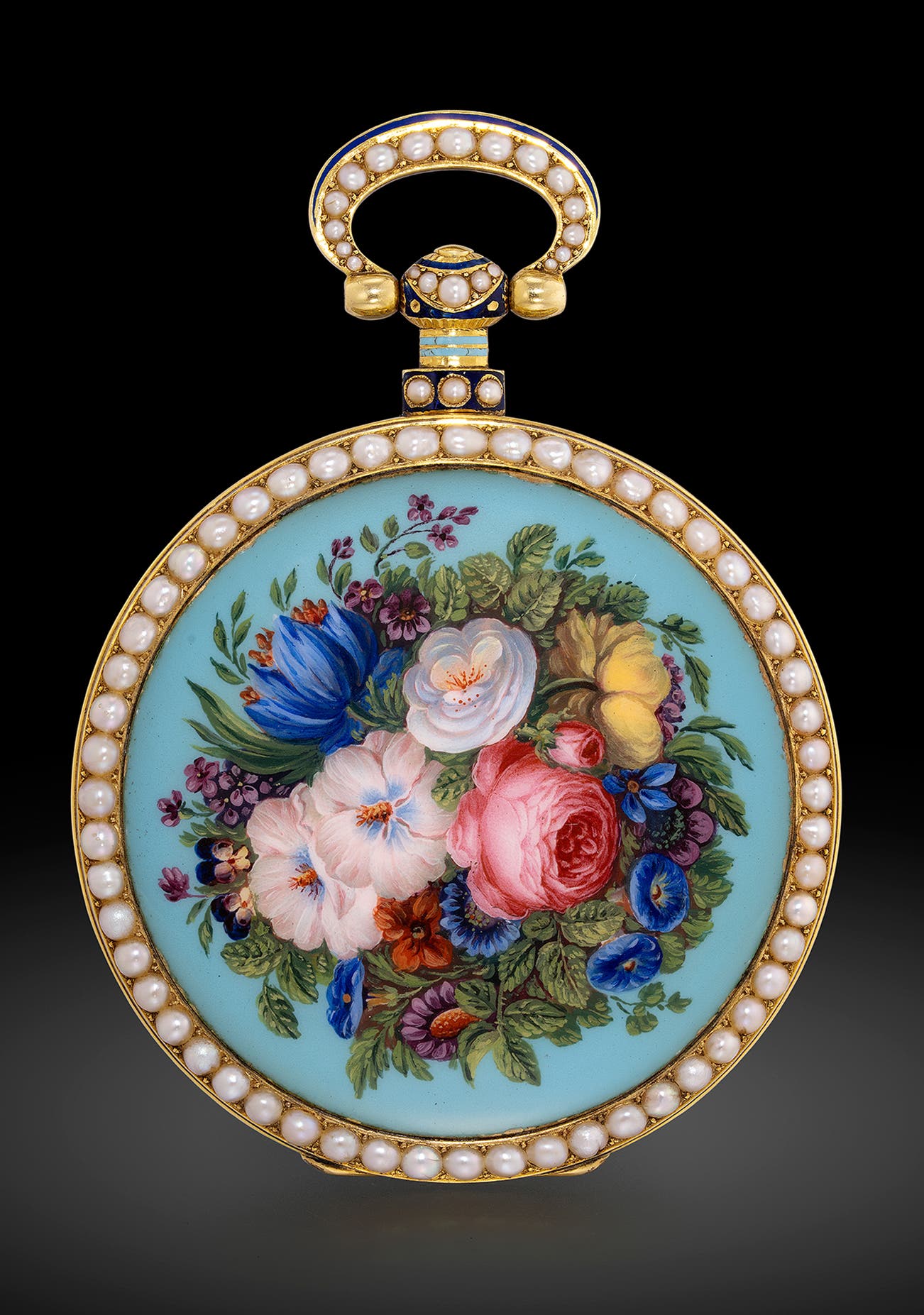 A very finely decorated and extremely well-preserved 18K yellow gold and pearl-set open faced pocket watch with Empire-styled case, miniature enamel painting depicting bouquets de Chine, white enamel dial with center seconds, engraved cuvette and movement and duplex escapement, made for the Chinese market