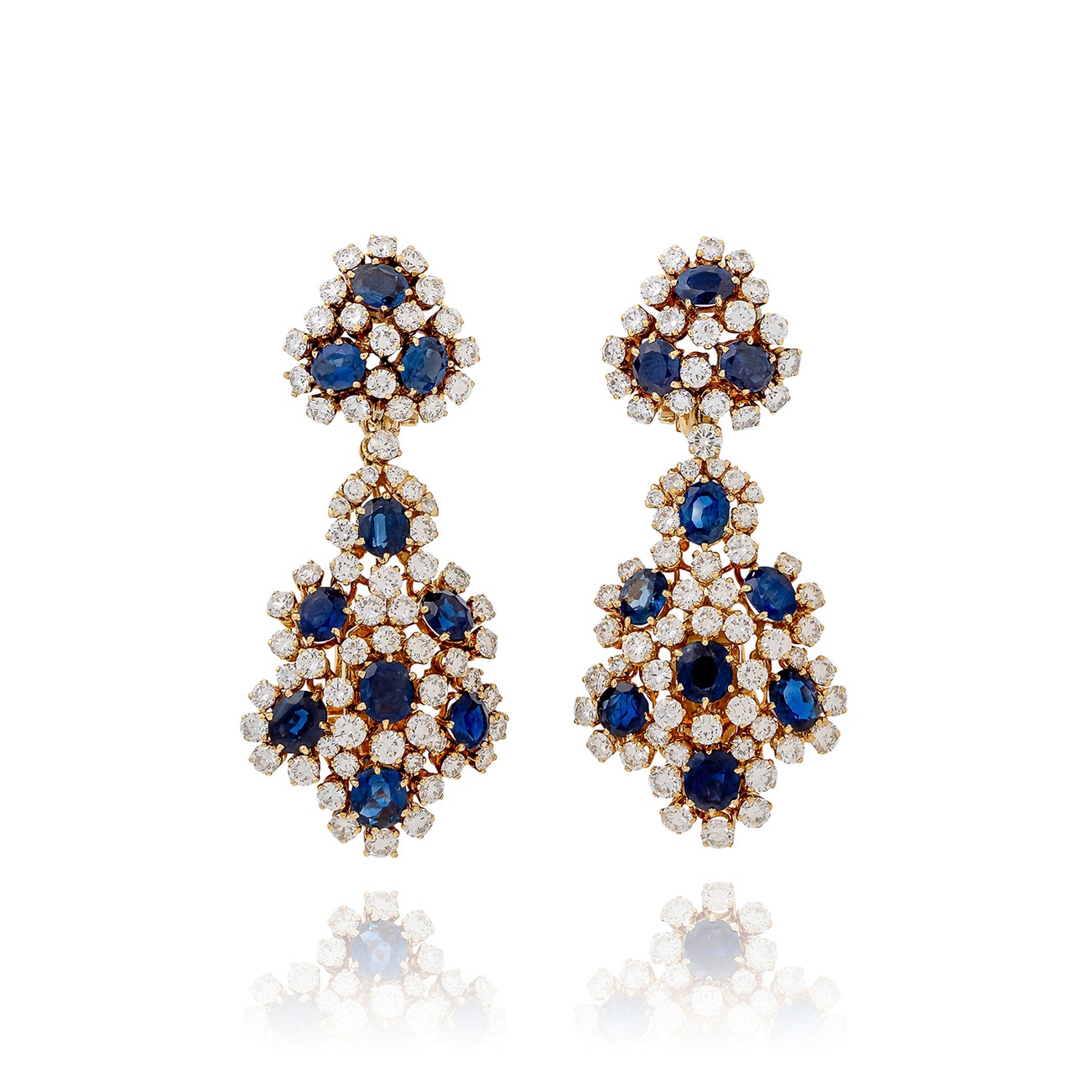Each set with oval and cushion-shaped sapphires, highlighted with brilliant-cut diamonds, length approximately 62mm, drop detachable and with ear clip fittings, measuring approximately 41 x 26mm, surmount detachable and with ear clip fittings, measuring approximately 21 x 18mm, each signed Vourakis, numbered.