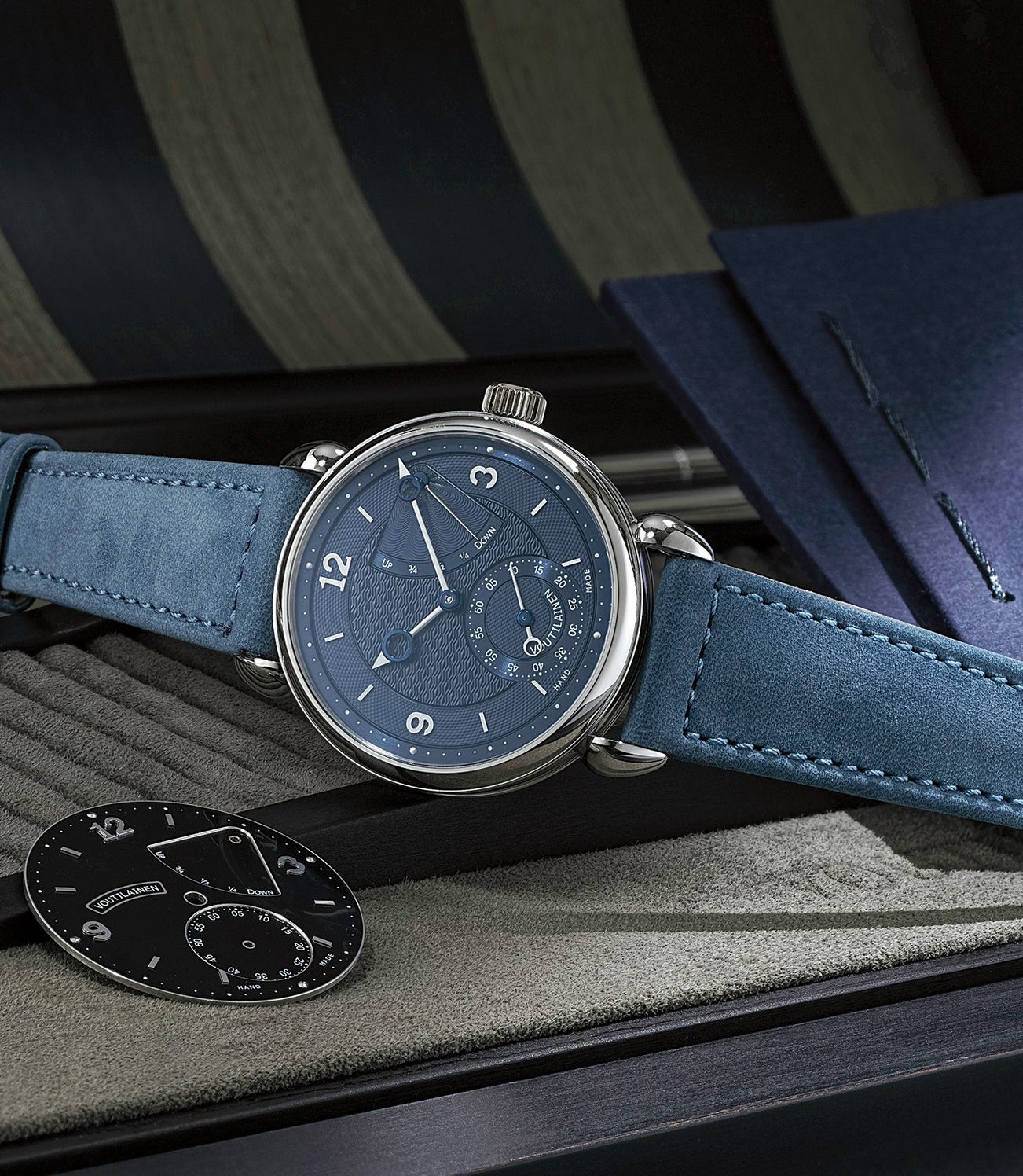 Made in only 25 pieces for Swiss watch retailer A l’Emeraude, the watch was originally offered with a black glossy dial, however the owner requested and obtained a superb blue dial featuring three different hand guilloché patterns. Voutilainen also created a new set of white gold satin brushed hands for optimal legibility specifically for this timepiece. The masculine 39mm platinum case sports Voutilainen’s signature tear drop lugs.