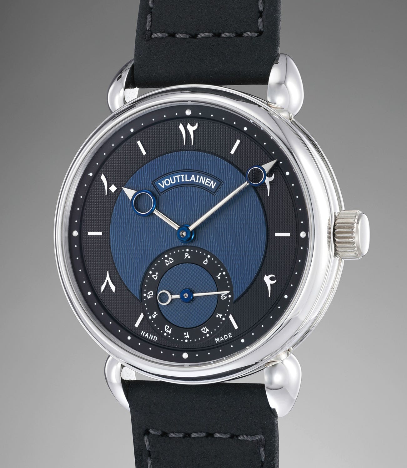 The masculine 39mm platinum case sports Voutilainen’s signature tear drop lugs.