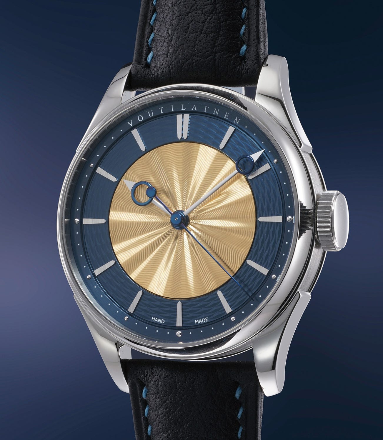 The most notable innovation of this watch is the material used for the case: AISI 316L grade 4441 steel. It is a solar-forged steel that is 100% recycled and recyclable, which reduces its carbon footprint. In Kari Voutilainen's words, " this brand new alloy marks the start of a revolution in the raw materials market – as demonstrated by the fact that the very first bar was used to machine this case". It is furthermore unique as the dial is blue and gold, while the limited edition version has a green and blue dial. Finally, the case also displays straight lugs, while the limited edition version has faceted lugs - Voutilainen's watches always have formed lugs, making this example truly one of a kind and incredibly special.