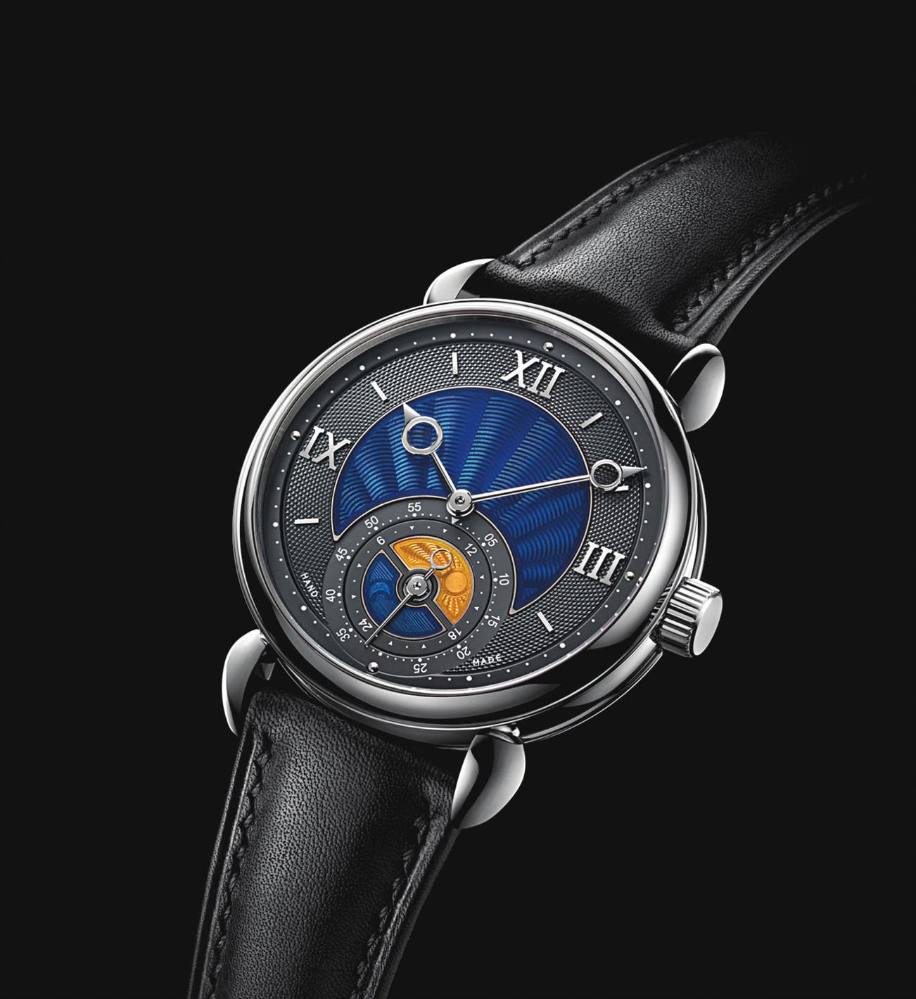 A GMT mechanism is integrated in the movement. Its indicator takes the form of a disc at 6 o’clock. The disc shows 24 hours and includes a day/night indicator. The triangle transferred to the subsidiary seconds dial represents the index by which the indication can be read. The disc is advanced by pressing the crown, each press moving the disc forward one hour at a time.